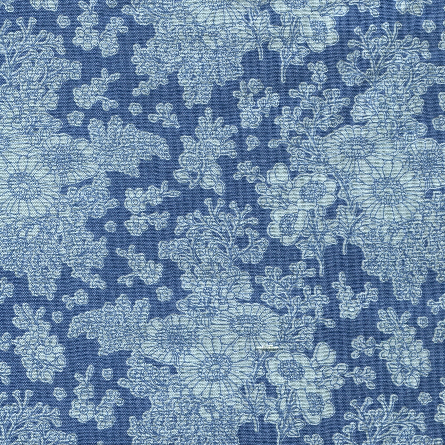 Sunkiss fra TILDA. Mørkere blå bund med mønster i lysere blå. 100% bomuld. Bredde ca. 1,10 m.